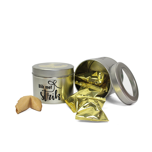 De blik met strik is een blik die gevuld is met vijf fortune cookies. De vijf fortune cookies worden vers bereid en daar in zitten natuurlijk spreuken of succes papiertjes in. Omdat de fortune cookies vers bereid worden zijn ze dus onweerstaanbaar. Je hebt ook de keuze om te kiezen uit twee verschillende kleuren: zilver en zwart. Wil je de ontvangers geluk wensen door verschillende soorten formaten? Kijk dan eens naar het medium blik en het grote blik! Want geluk moet verspreid worden door allerlei soorten formaten.
