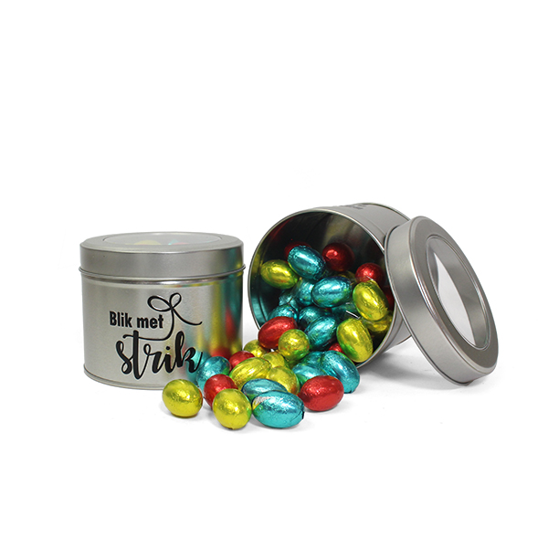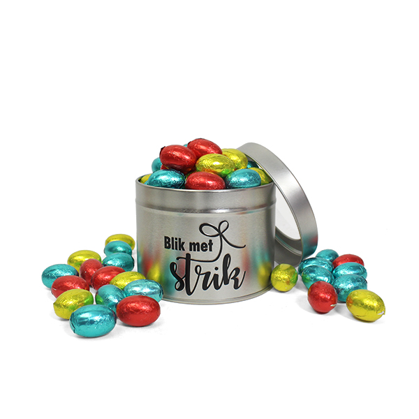 Het is een grijze ronde blink wat gevuld is met massieve paaseitjes. De chocolade paaseitjes hebben verschillende soorten kleuren en daardoor ziet het er ook nog eens vrolijk uit. Als vervolgens de paaseitjes weer op zijn dan kun je het blik weer hergebruiken voor iets anders. En dat maakt dit geschenk smakelijk, ideaal en duurzaam. Wie wil jij verrassen met een smakelijk blikje dit jaar?