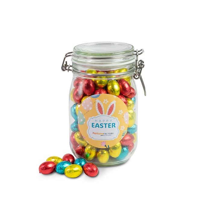 Deze grote weckpot is van glas en wordt gevuld met ca. 725 gram paaseitjes in diverse kleuren. Hierbij ontvang je een kleurenmix van massieve chocolade paaseitjes. Voor elk wat wils!